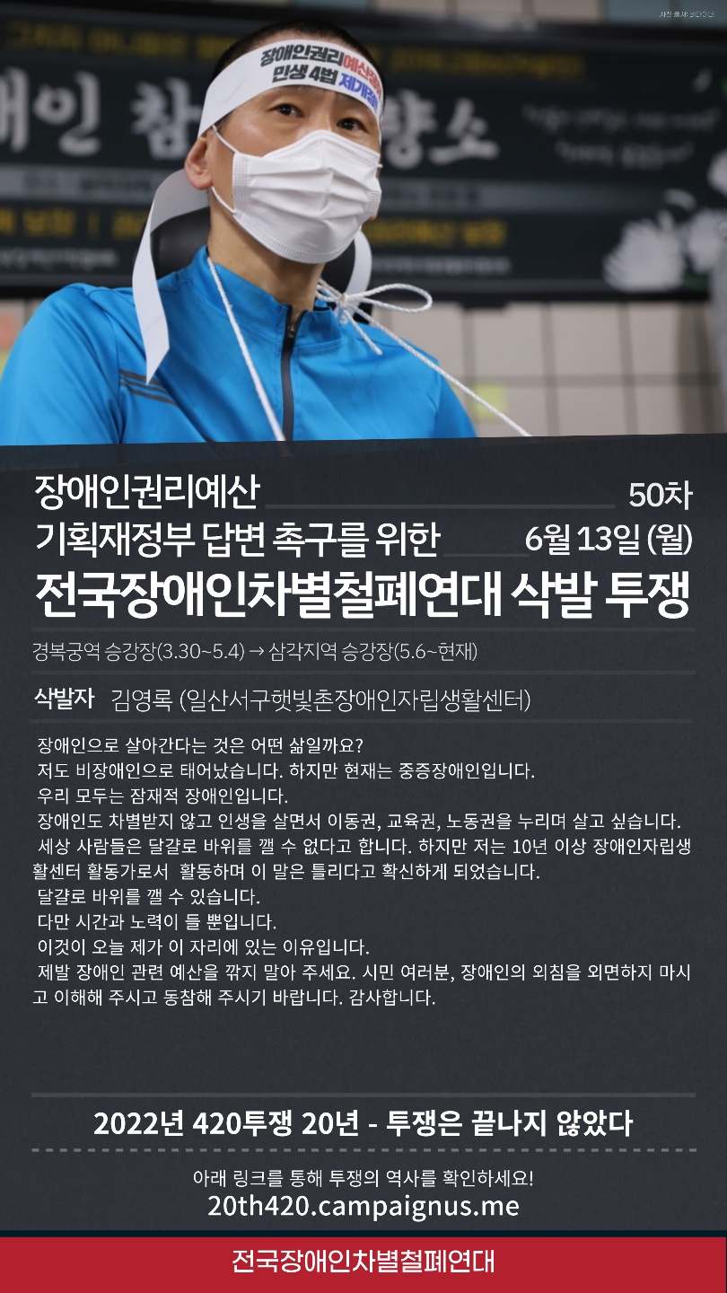- 다음글6월 8일~9일 장애인권리보장법 장애인탈시설지원법 제정 농성장 주야간사수 451일차 22.10.17