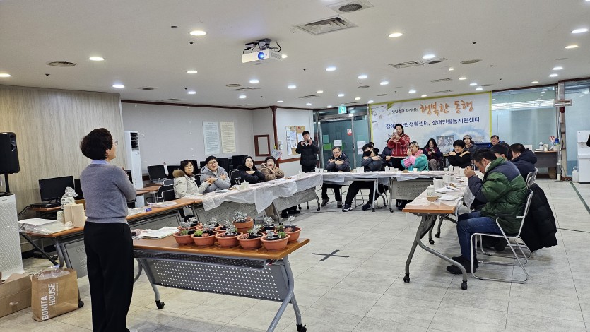 2026. 01. 27. 장애인자립지원기술교육(ILP) 원예교육 페이지 정보 작성자 햇빛촌 조회 227회 작성일 26-01-28 15:39 본문 2026. 01. 27 (ILP) 원예교육 목록 이전글2026.02.10 고양세무서 후원물품 전달식 26.02.10 다음글2025년 12월 02일 미술교실(캘리그라피) 25.12.26