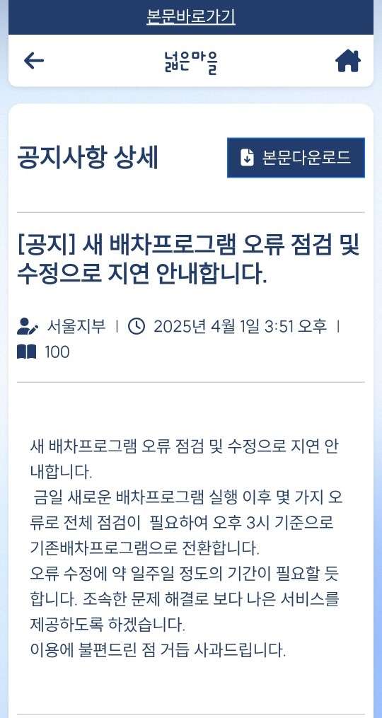 둘째, 사전 안내 부족이다. 시스템 적용 전, 이용자들에게 문자로 공지하는 것이 필수적이었음에도 불구하고, 시각장애인 커뮤니티 홈페이지인 '넓은 마을'에 간단한 공지를 게시하는 것으로 그쳤다. 홈페이지 공지만으로는 접근성이 떨어지므로, 확보된 회원들의 휴대전화로 문자 알림을 제공하는 것이 보다 효과적인 방법이었을 것이다.