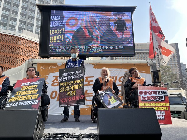 전국장애인부모연대 윤종술 대표는 "180명의 원생이 살고 있는 울산 재활원에서 CCTV에서 나온 폭행만 800건 이상이다. CCTV가 없는 곳에서는 얼마나 구타가 일어났는지 알 수 없다. 이런 시설 당연히 폐쇄해야 한다"면서 “탈시설지원법이 아니라, 시설폐쇄법으로 모든 시설들 확 없애버려 한다. 그래야 기본적인 인권, 자립생활 권리가 제대로 보장될 것이다. 대한민국을 시설 없는 나라로 만들자"고 '탈시설'을 성토했다.