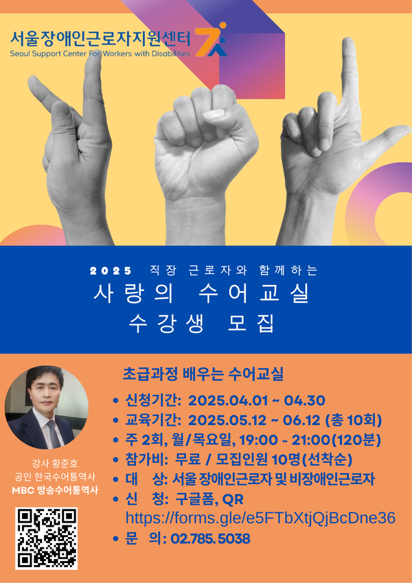 이 과정은 청각장애인 근로자와의 원활한 소통을 돕고, 직장에서의 소통 장벽을 허무는 계기가 될 것으로 기대된다. 신청은 구글폼(https://forms.gle/e5FTbXtjQjBcDne36)으로 하면 된다.
