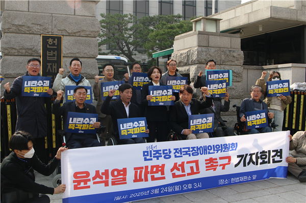 서미화 위원장은 “반헌법·반민주·반인권적 비상계엄 선포를 통해 장애인을 포함한 모든 국민의 권리를 정시시키고, 안전과 생명을 위협하는 내란책동을 벌였다"면서 "선고 지연으로 심화되는 경제적·정치적 혼란과 민주주의 가치의 훼손을 멈추기 위해 헌법재판소가 조속히 파면 선고를 해야할 것"이라고 요구했다.