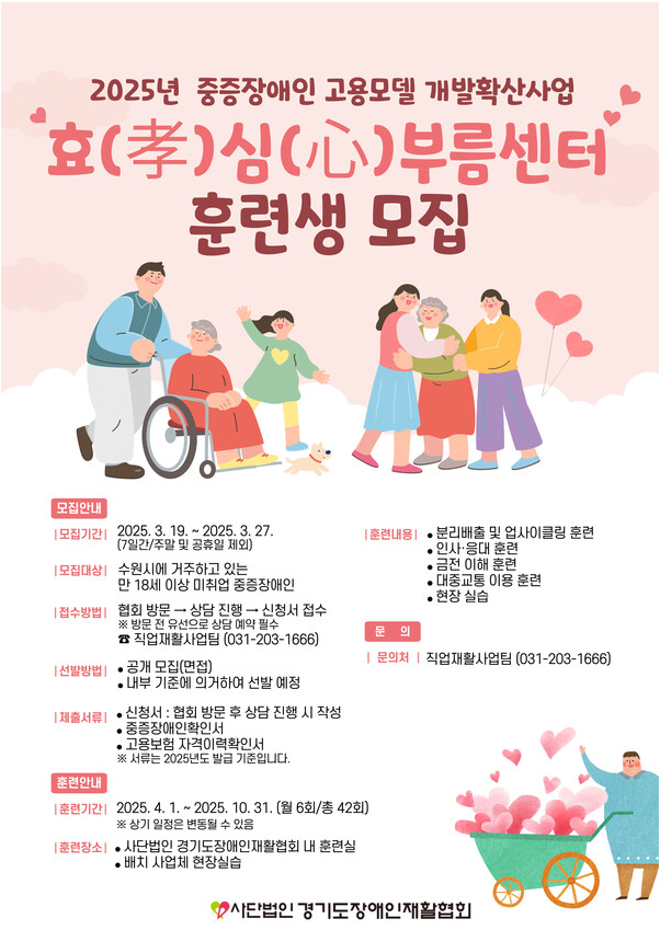 경기도장애인재활협회가 오는 27일까지 경기도에 거주하는 중증장애인을 대상으로 2025년 중증장애인 고용모델 개발·확산사업 ‘효(孝)심(心)부름센터’의 훈련생를 모집한다.ⓒ경기도장애인재활협회