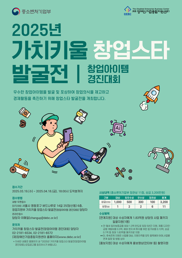 이번 대회는 장애인 예비 창업자 또는 창업 7년 미만 기창업자를 대상으로 하며, 중소벤처기업부 장관상이 수여된다.