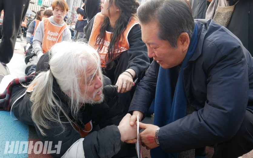 그제야 정 의원은 자리에서 일어나 장애인들과 대화했다. 박경석 전국장애인차별철폐연대(아래 전장연) 상임공동대표는 “국정조사 진행하면 정부서울청사 앞 농성을 그만두겠다 했더니 의원님이 알겠다 하셨다”고 말했다.