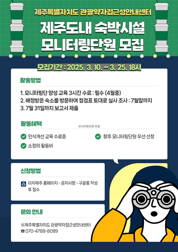 제주특별자치도 관광약자접근성안내센터는 오는 25일까지 제주도 내 숙박업소의 장애인 편의시설 설치 현황을 점검하고 정보를 수집할 모니터링단을 모집한다.