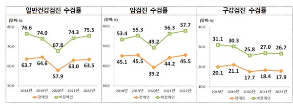 일반건강검진, 암검진, 구강검진 수검률 비교.ⓒ국립재활원
