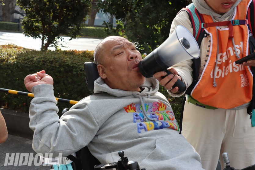 마찬가지로 탈시설한 지 2년여 된 이은혜 경기장애인차별철폐연대 활동가는 AAC(보완대체의사소통)를 통해 “윤석열 탄핵과 오세훈 퇴진, 그리고 장애인의 권리 증진과 차별 종식을 위해 앞장서 싸우기 위해 일본에 투쟁하러 왔다”며 “우리도 한 명의 사람으로서 행복하게 살고 싶다. 우리도 한 명의 사람으로서 이동하며 살고 싶다. 우리도 노동자이다. 장애인도 비장애인과 똑같이 지역사회에서 살아야 한다”고 발언했다.