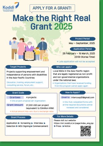 '2025년도 장애인권리실천 해외공모사업(Make the Right Real Grant 2025)」은 아·태 지역 장애인 권리 실현을 위한 ‘인천전략'*의 지속적인 이행을 위한 사업으로, 각 국의 특수한 지역 특성 및 욕구를 반영한 장애인 역량강화 및 자립지원 사업을 선정하여 지원하는 사업이다.