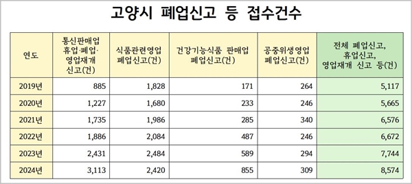 고양시, 폐업신고 건수 매년 늘어 '폐업·휴업·영업재개 신고 등 민원 10.7% 증가'