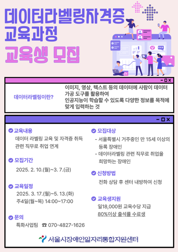 서울시장애인일자리통합지원센터, 데이터라벨링자격증교육과정’교육생 모집