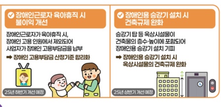 이중 장애인 정책 관련으로는 장애인근로자 육아휴직시 장애인고용률 산정제외에 따른 불이익을 개선한 점이다.