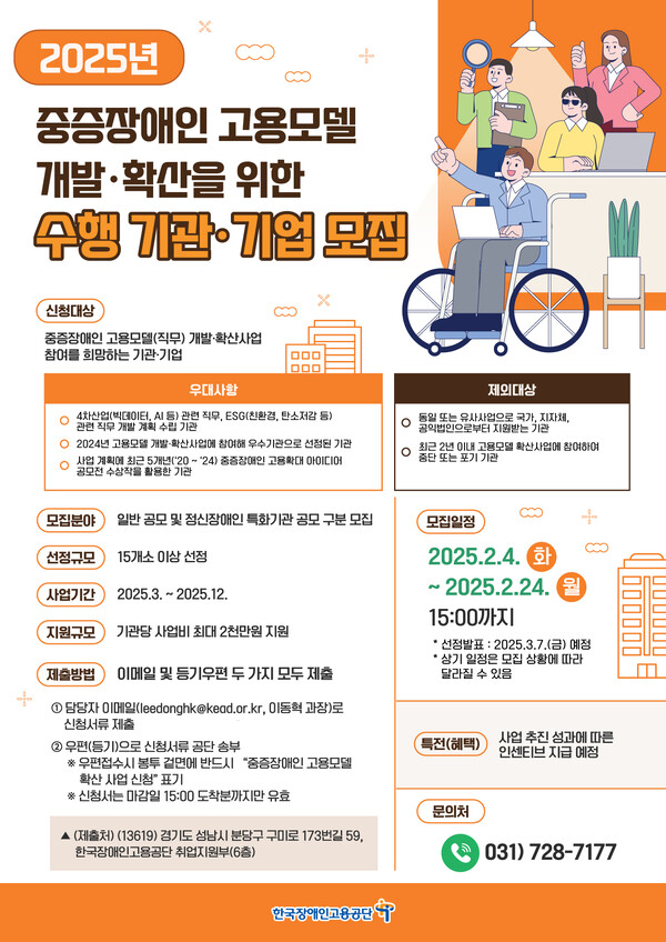 중증장애인 고용모델 개발·확산 사업은 중증장애인의 고용영역, 직무 확대를 위해 민간기업 및 기관이 장애인의 새로운 직무를 개발하고 취업을 통해 직무를 확산하는 민간기업, 기관을 지원하는 사업이다.
