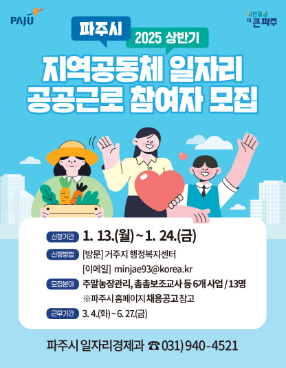 참여 희망자는 모집 기간 내 신청서와 구비서류를 준비해 거주지 또는 사업지 행정복지센터에 제출해야 한다. 자세한 사항은 파주시청 누리집(공고, 홍보→채용공고) 또는 파주시청 일자리경제과(☎031-940-4521)로 문의하면 된다.
