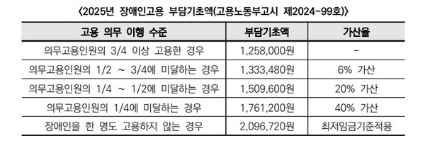 먼저 의무고용률에 못 미치는 100인 이상 사업주 등에게 부과하는 ‘장애인 고용부담금’ 부담기초액이 월 125만8000원으로 인상되며, 한 명도 고용하지 않을 시 최저임금인 209만6270원을 내야 한다. 장애인 의무고용률은 국가 및 지자체, 공공기관의 경우 3.8%, 민간기업은 3.1%다.