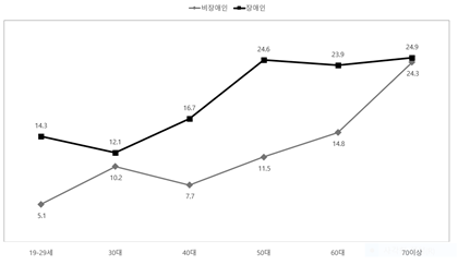 장애인과 비장애인의 입원률 비교.ⓒ한국보건사회연구원(2017)장애인의 건강한 삶 정책을 위한 건강권 증진 방안 연구. 86쪽.
