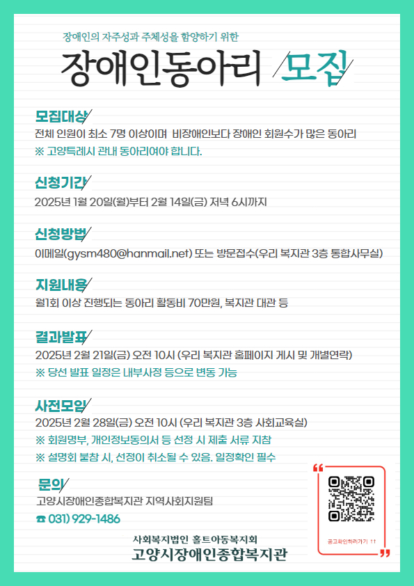 선발된 동아리는 3월부터 10월까지 8개월간 활동해야 하며, 해당 기간 동안 최대 70만 원의 운영비를 지원받는다. 신청은 복지관 홈페이지(https://goyangrehab.or.kr/bbs/board.php?bo_table=0401&wr_id=14701)를 참고해 2월 14일 오후 6시까지 접수하면 된다.