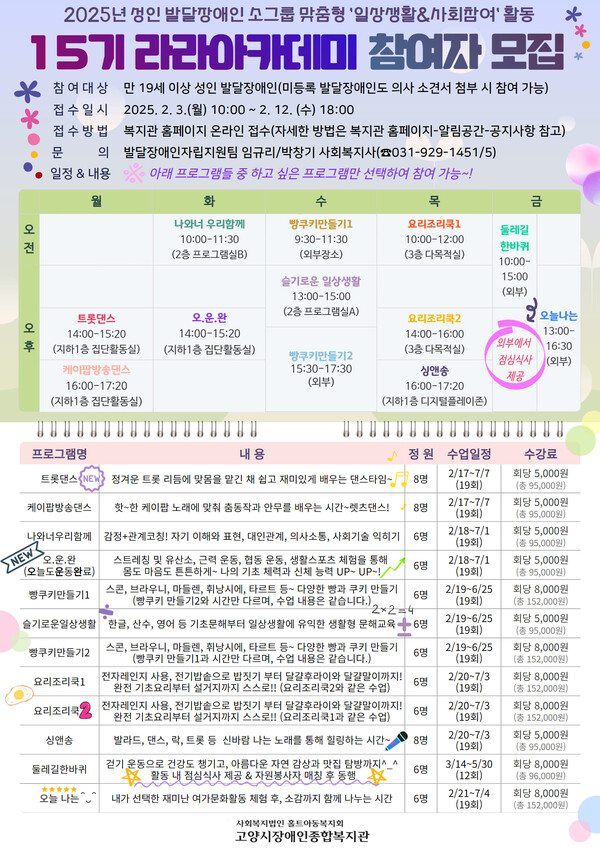 프로그램 참여자 모집은 2월 3일부터 12일까지로, 복지관 홈페이지(https://www.goyangrehab.or.kr/bbs/board.php?bo_table=0401&wr_id=14699)를 통해 온라인 선착순 접수로 진행된다.