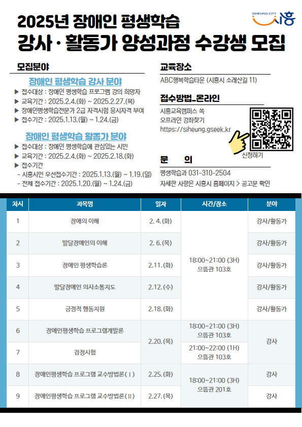 자세한 사항은 시흥시청 누리집의 공고문을 참조하면 된다. 관련 문의는 시흥시 평생학습과 장애인평생학습팀(031-310-2504)으로 문의하면 된다.