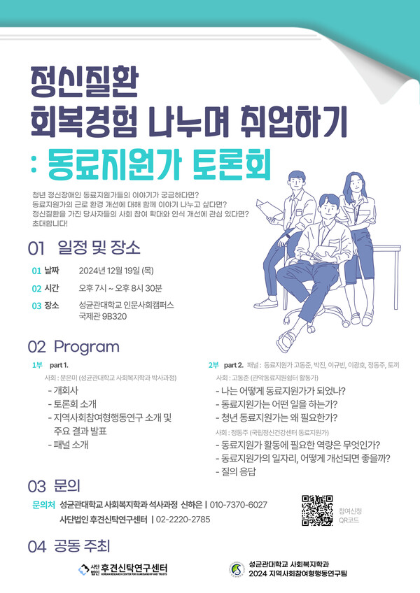 행사는 총 2부로 구성된다. 1부에서는 연구팀이 지역사회 참여형 행동연구의 주요 결과를 발표하며, 2부에서는 청년 동료지원가 7명이 패널로 참여해 근로 경험과 환경 개선에 대한 다양한 논의를 진행할 예정이다.