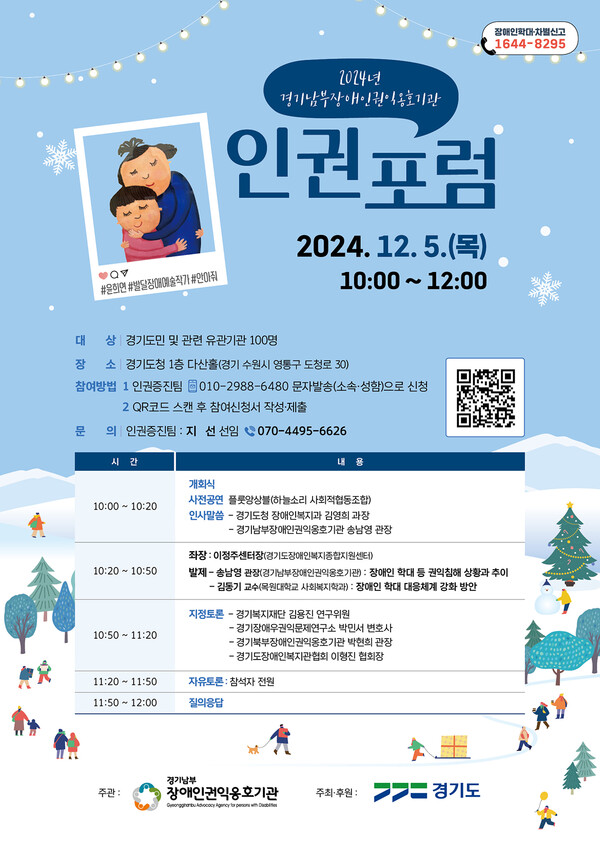 이날 인권포럼은 12월 2일부터 6일까지 세계장애인의 날(12월 3일) 기념 공감주간 행사의 일환으로, ‘장애인 학대 등 권익 침해상황’에 대해 경기남부옹호기관 송남영 관장과 ‘장애인 학대 등 대응체계 강화방안’에 대해 목원대학교 사회복지학과 김동기 교수가 함께 발제할 예정이다.