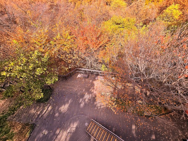 전망대에서 내려다보는 가을의 숲은 그 자체로 한 폭의 그림이며, 서울의 산하와 자연이 어우러진 풍경은 시간이 멈춘 듯한 감동을 줍니다. 전망대를 둘러본 후에는 데크길을 따라 한 바퀴 돌아 정원 입구로 연결되는 순환 산책로가 이어져 있어 가을의 여유로운 산책을 마무리하기에 좋습니다.