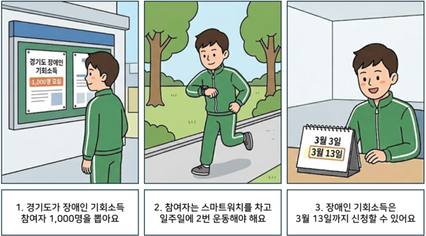 1 경기도가 장애인 기회소득 참여자 1,000명을 뽑아요. 2 참여자는 스마트워치를 차고 일주일에 2번 운동해야 해요. 3 장애인 기회소득은 3월 13일까지 신청할 수 있어요. ©AI 편집실