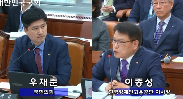 먼저 우 의원은 이종성 한국장애인고용공단 이사장을 불러 “장애인고용률이 어느 정도 되는지, 낮은 이유가 뭔지”에 관해 물었다. 이 이사장은 “평균적으로 3.71%를 기록하고 있고, 전반적으로 장애인고용 인식 자체가 낮다”고 답했다.