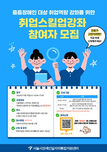 서울시장애인일자리통합지원센터(이하 센터)는 서울특별시 거주 중증장애인을 대상으로 취업스킬업강좌 4회차 참여자 모집 중이라고 22일 밝혔다.