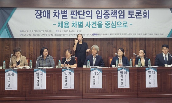 김포장애인자립생활센터 등 장애인단체와 더불어민주당 환경노동위원회 안호영 의원을 비롯해 9명의 의원이 공동으로 27일 국회도서관 소회의실에서 개최한 ‘장애 차별 판단의 입증책임 토론회 : 채용차별 사건을 중심으로’에서다.