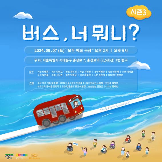 ‘버스, 너 뭐니?’는 경기문화재단 장애인 예술지원사업 일환으로 진행되며, 장애인 일행 다섯명과 장애인 여행 유튜버, 새내기 활동지원사의 대중교통을 이용한 좌충우돌 여행기를 다룬다. 앞서 지난 2022년과 2023년에도 공연한 바 있다.