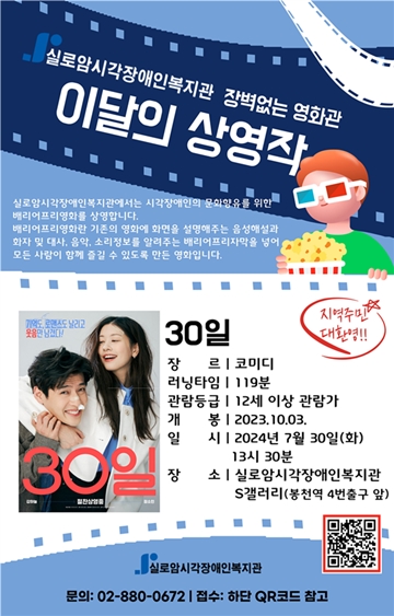 시각장애인의 문화 향유권을 확대하기 지난 5월을 시작으로 매달 마지막 주 화요일을 지정해 월 1회 ‘장벽없는 영화관’을 진행하고 있다. 5월과 6월에 방영한 ‘서울의 봄’, ‘인생은 아름다워’에 이어 오는 30일에는 영화 ‘30일’을 상영할 예정이다.