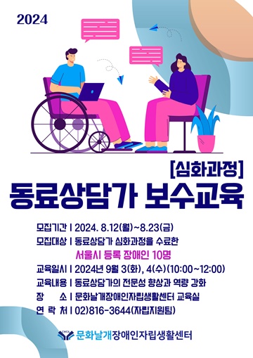 교육은 9월 3일과 4일 양일간 오전 10시부터 12시까지 2시간씩 진행되며 모집대상은 동료상담 심화과정을 수료한 서울시 등록된 장애인 10명이다.