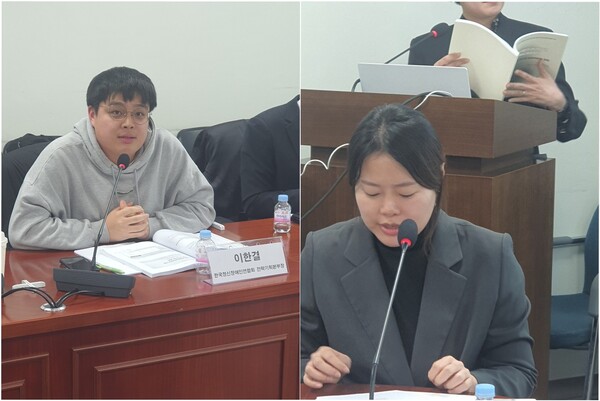 장애 분리 통계 중요성 언급한 한국정신장애인연합회 이한결 전략기획본부장(좌측), 사법접근권 이행실태를 발표한 민주사회를위한변호사모임 정지민 변호사(우측). ⓒ이원무