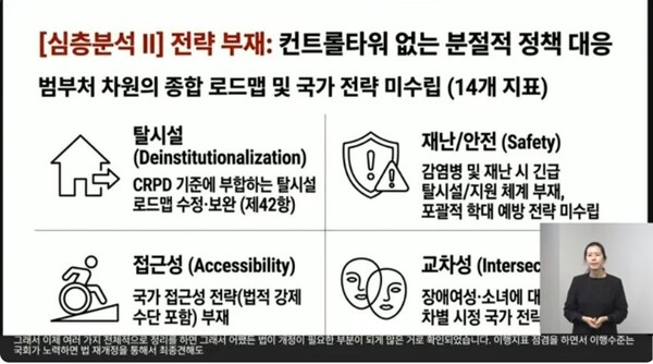 사실 2차년도와 달라진 것은 없다. 탈시설 로드맵 수립 관련 지표 요지부동, 여전한 접근성 보장 및 교차차별 종식 전략과 장애 분리통계 등의 부재, 장애의 의료적 모델 고수와 장애인 빈곤률 악화 등으로 장애인의 삶이 더욱 팍팍해진 것 등은 그대로다. 더군다나 이번 보고회엔 안 나왔지만, 새로운 이슈들의 등장으로 인해 걱정되는 것도 있다.