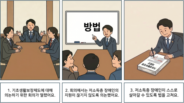 2. 회의에서는 저소득층 장애인*이 일할 때 기초생활보장제도*가 끊기지 않도록 의논했어요.