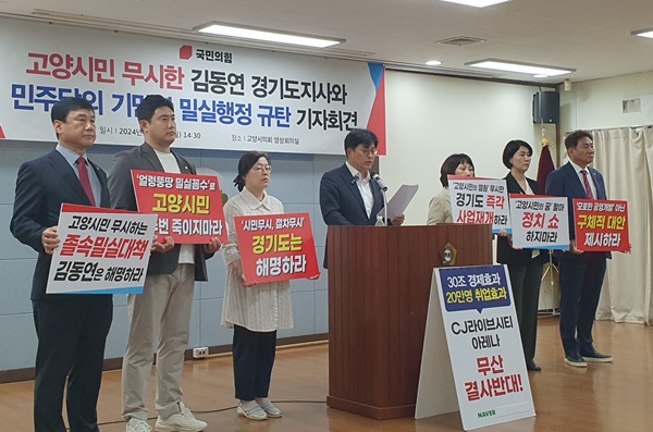 이날 고양시병 당협의 오준환 의원 등 시·도의원들이 함께한 자리에서 성명서를 발표한 김종혁 당협위원장은 “경기도가 지난 17일 CJ 공연장 건설을 포함한 K-컬처밸리 사업을 원안대로 추진하겠다는 대책을 발표했다”며 “불과 이틀 전 열린 주민설명회에서는 ‘구체적인 계획이 없다’며 논의를 시작하겠다고 밝혔던 것과 상반된 행보로, 이는 주민의견 수렴이 없는 밀실행정”이라고 비판했다.