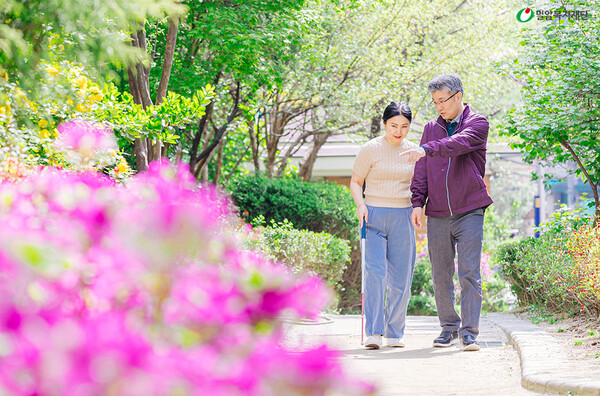 보행 훈련을 하는 이용자와 훈련을 돕는 헬렌켈러센터 직원. ©밀알복지재단