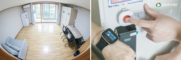 공간마다 몰딩을 다르게 해 촉감으로 각각의 공간을 구별하기 쉽게 만들었으며, 시설 내 모든 물품에 점자스티커를 부착해 어떤 물건인지 알 수 있도록 했습니다. 또한 현관벨을 누르면 입소자의 손목시계로 진동이 울리는 시스템을 도입해 사람이 방문한 것을 파악할 수 있도록 했습니다.