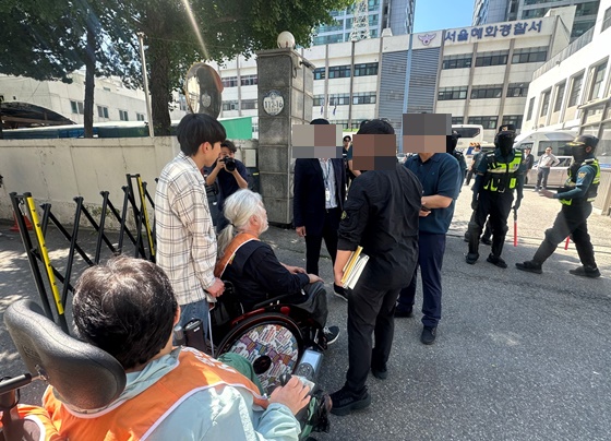 기자회견 후 경찰조사를 위해 혜화경찰서에 출석하고 있는 전국장애인차별철폐연대 박경석 상임공동대표와 서울시장애인자립생활센터협의회 이형숙 대표. ©전국장애인차별철폐연대