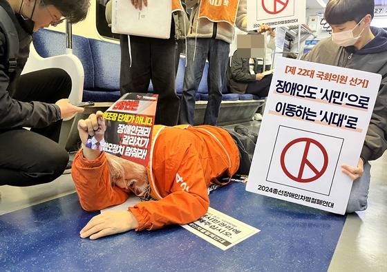 전국장애인차별철폐연대 박경석 상임공동대표가 지난 4월 2일 서울 4호선 삼각지역에서 장애인권리투표를 호소하며 포체투지를 진행하고 있다. ⓒ에이블뉴스DB