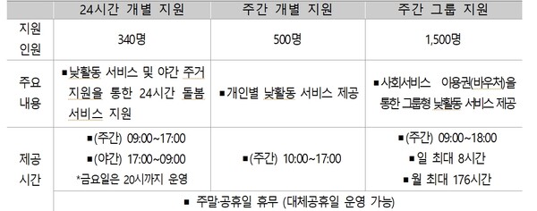 서비스 유형은 야간돌봄을 포함한 24시간 개별 서비스 340명, 낮활동 서비스로 주간 개별형 500명과 주간 그룹형 1500명으로 총 2340명에게 제공하게 된다.