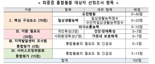최중증 통합돌봄 대상자 선정조사 항목. ©보건복지부