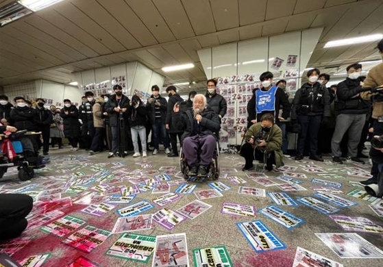 지난 2023년 2월 13일 전국장애인차별철폐연대가 서울 지하철 4호선 삼각지역 승강장에서 기자회견을 하며 스트커를 붙이고 바닥에 락카칠을 한 모습. ⓒ전국장애인차별철폐연대