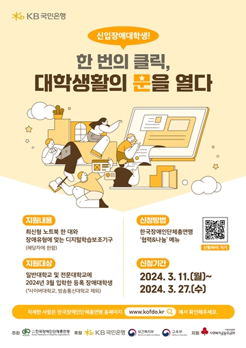 KB국민은행의 후원과 사회복지공동모금회의 지원으로 진행되는 ‘KB 신입장애대학생 노트북지원사업’은 신입 장애대학생의 학습 환경 편의 증진과 경제적 부담을 완화하기 위해 매년 장애대학생 130여명을 선발해 노트북을 비롯한 디지털 학습보조기기를 선물하고 있다.