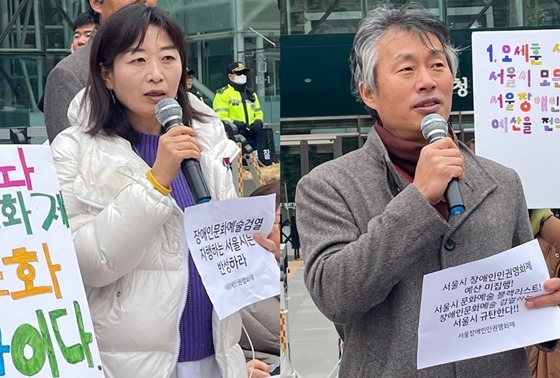 5일 오전 11시 30분 서울시청 앞에서 ‘장애인문화예술 검열하는 서울시 규탄 기자회견’에서 발언하는 인권네트워크 바람 명숙 활동가(왼쪽)와 서울장애인인권영화제 이상엽 대표(오른쪽). ⓒ서울장애인인권영화제