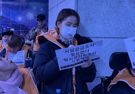 또한 “장애인 당사자들은 이렇게 거짓말로 꾸며진 시설감금 지원조사는 필요 없다. 오세훈 서울시장은 장애인을 촘촘히 가두는 시설감금 정책을 그만두고 탈시설을 가로막지 말라. 지금 당장 우리와 대화에 나서라”고 외쳤다.