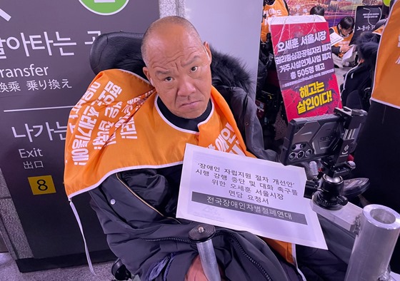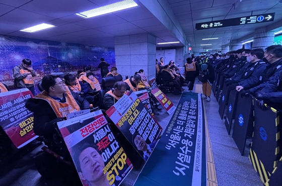 전국장애인차별철폐연대(이하 전장연)는 29일 서울 시청역 1호선에서 전국탈시설장애인연대와 함께 ‘서울시 시설수용 지원 절차 중단 및 대화 촉구 기자회견’을 개최했다.