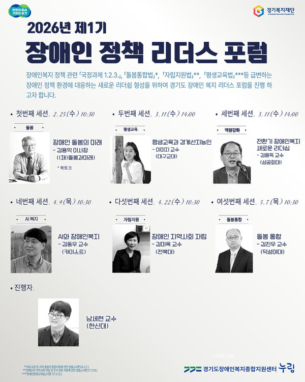 이후 과정에서는 ▲평생교육과 경계선 지능인(이미지 교수, 대구교대) ▲전환기 장애인복지 새로운 리더십(김용득 교수, 성공회대) ▲AI와 장애인복지(김동우 교수, KAIST) ▲장애인 지역사회 자립(김미옥 교수, 전북대) ▲돌봄 통합(김진우 교수, 덕성여대) 등 주요 정책 의제를 중심으로 전문가 강연과 라운드테이블 토론이 이어진다.