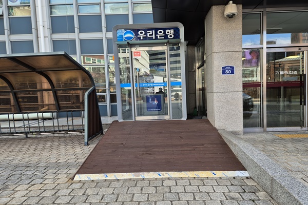 한편 가톨릭회관 옆 ATM(현금자동입출금기) 출입문 앞에 경사로는 경사도가 가파르지는 않지만 출입문과 경사로 사이에 휠체어 등을 멈출 수 있는 공간이 없어 문제다. 즉 휠체어를 사용하는 장애인이 문을 열 때 경사 때문에 뒤로 밀려 안전사고가 우려되는 것이다.